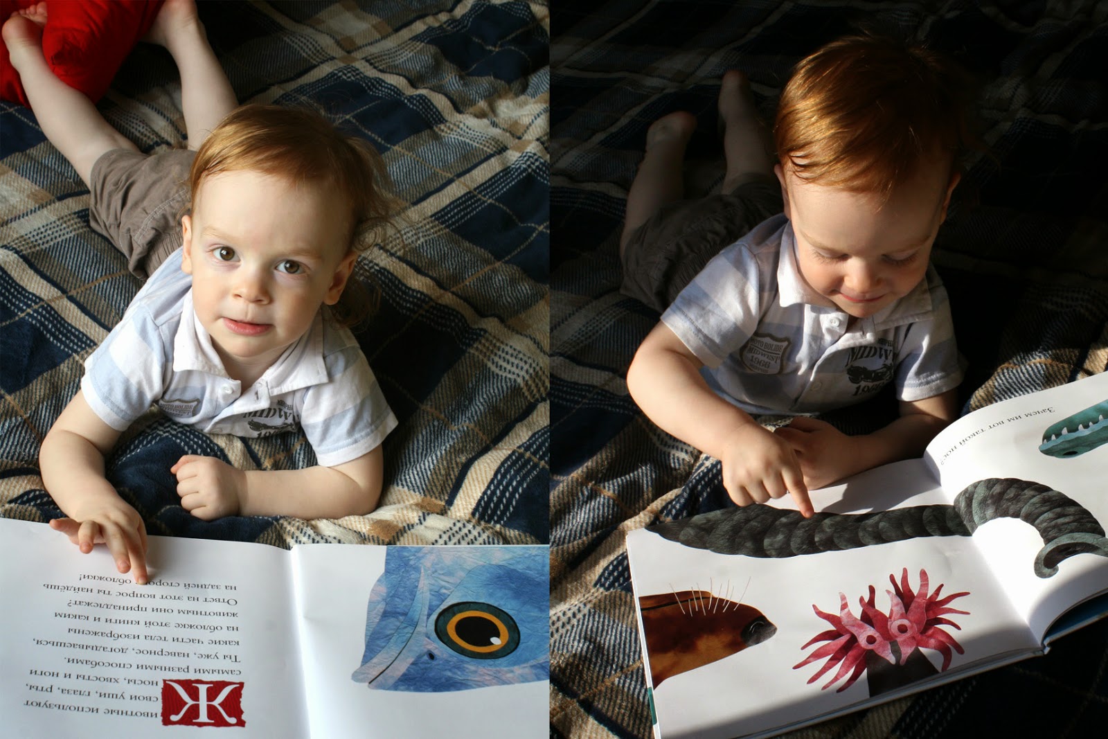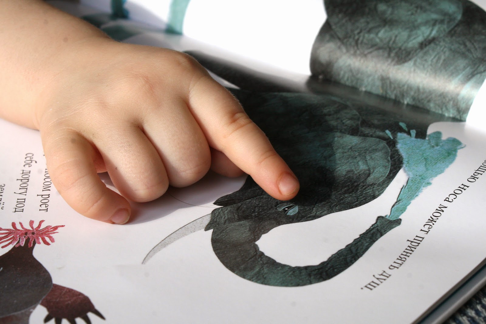 И еще много интересного – как широко может змея открыть рот, чтобы проглотить добычу; как обезьянка здорово висит на ветке с помощью хвоста; как крот носом роет землю…  И я ему практически ничего не объясняю. Иллюстрации настолько точные, что он сам во всем разбирается. Книгу “читаем” не взахлеб, но она для нас долгоиграющая. Открывая каждый раз, учимся чему-нибудь новому. И я уверена,  еще много открытий ждет нас.  Думаю, что для нашего возраста (2года) это более чем нормально.