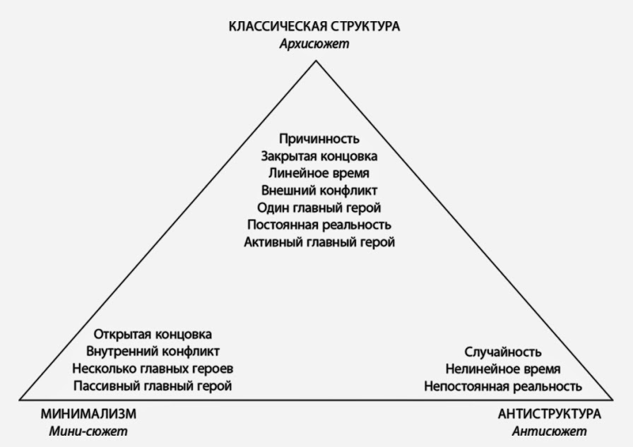 Перед созданием любой истории необходимо определиться с ее будущей структурой. Базовых структур всего три: Архисюжет, Мини-сюжет и Антисюжет. Архисюжет предполагает, что фильм будет логично выстроен, в нем будет главный герой и в конце фильма будут даны ответы на все вопросы. Мини-сюжет, наоборот, зачастую в конце фильма оставляет несколько открытых вопросов, чтобы их могли додумать сами зрители. В Антисюжете, как видно из названия, царствует случайность событий, непостоянство, да и сюжет может развиваться от будущего к прошлому.