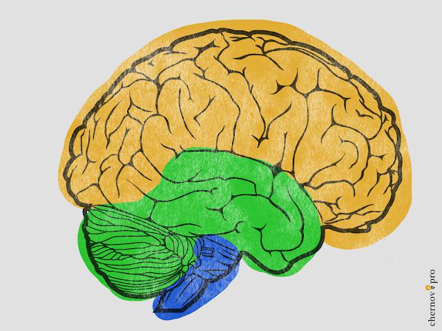 Очень грубо мозг можно разбить на три части, на рисунке они подсвечены разными цветами. Причем синяя часть появилась самой первой. Её в 1990 году ученый Поль Мак-Лин назвал “уровнем рептилии”. Затем идет зеленая часть, которая называется “уровнем древних млекопитающих”. И наконец самая молодая желтая часть – “уровень молодых млекопитающих”.