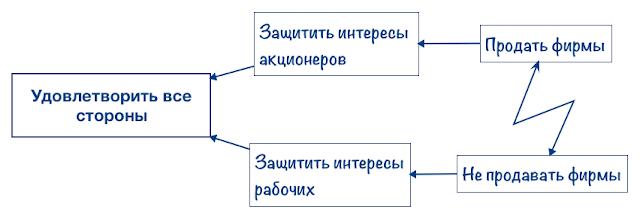 Такой прием позволяет не только увидеть конфликт, но и понять его предпосылки. А также найти общую цель. Если конфликт очевиден (например на переговорах), то можно начинать схему с правой части. Это позволит найти общие интересы и найти новые методы обеспечения, которые не будут между собой конфликтовать. В случае, когда известна задача и есть несколько вариантов решения, вы сможете выявить скрытые конфликты.