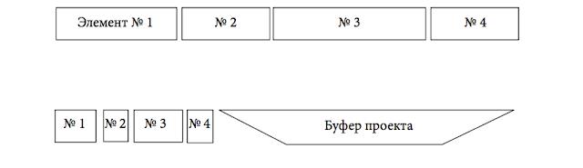 Это означает, что каждый элемент должен выполняться настолько быстро, насколько это было оценено изначально. Без учета заложенного времени на возможные непредвиденные случаи. Вероятность уложиться в начальные оценки по времени составляет примерно 50% (не буду вдаваться в математику, в книге прекрасно описано откуда берется эта цифра). Это значит, что в нашей схеме как минимум половина элементов не будет выполнена в срок. И им придется использовать время в буфере проекта. Но так же это означает, что если какой-то элемент уложился в срок, то освобожденное время не получится выбросить впустую, оно аккумулируется в буфере.