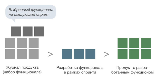 Вся работа ведется спринтами. К концу каждого спринта команда должна предоставить очередную порцию выполненных полностью рабочих и протестированных “кусочков” проекта. Спринт обычно длится 2 недели.