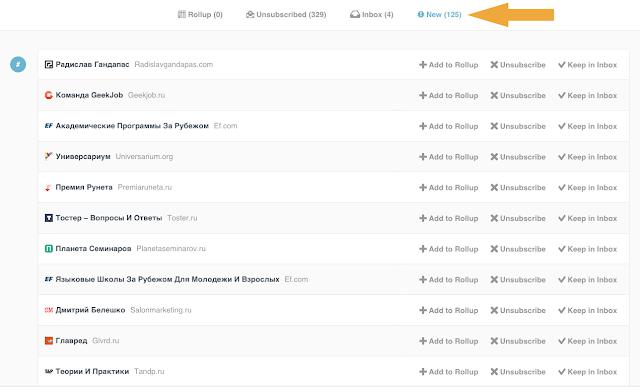 И ужаснуться огромному количеству подписок. В верхнем меню нужно выбрать “New” и отписаться от тех сервисов, которые уже не актуальны. Причем есть отличная возможность добавить рассылку в список Rollup. Это отдельный список, который будет собирать рассылки, которые приходят в течении дня и присылать вам одним письмом, можно выбрать в какое время высылать это письмо (утром, в обед или вечером).
